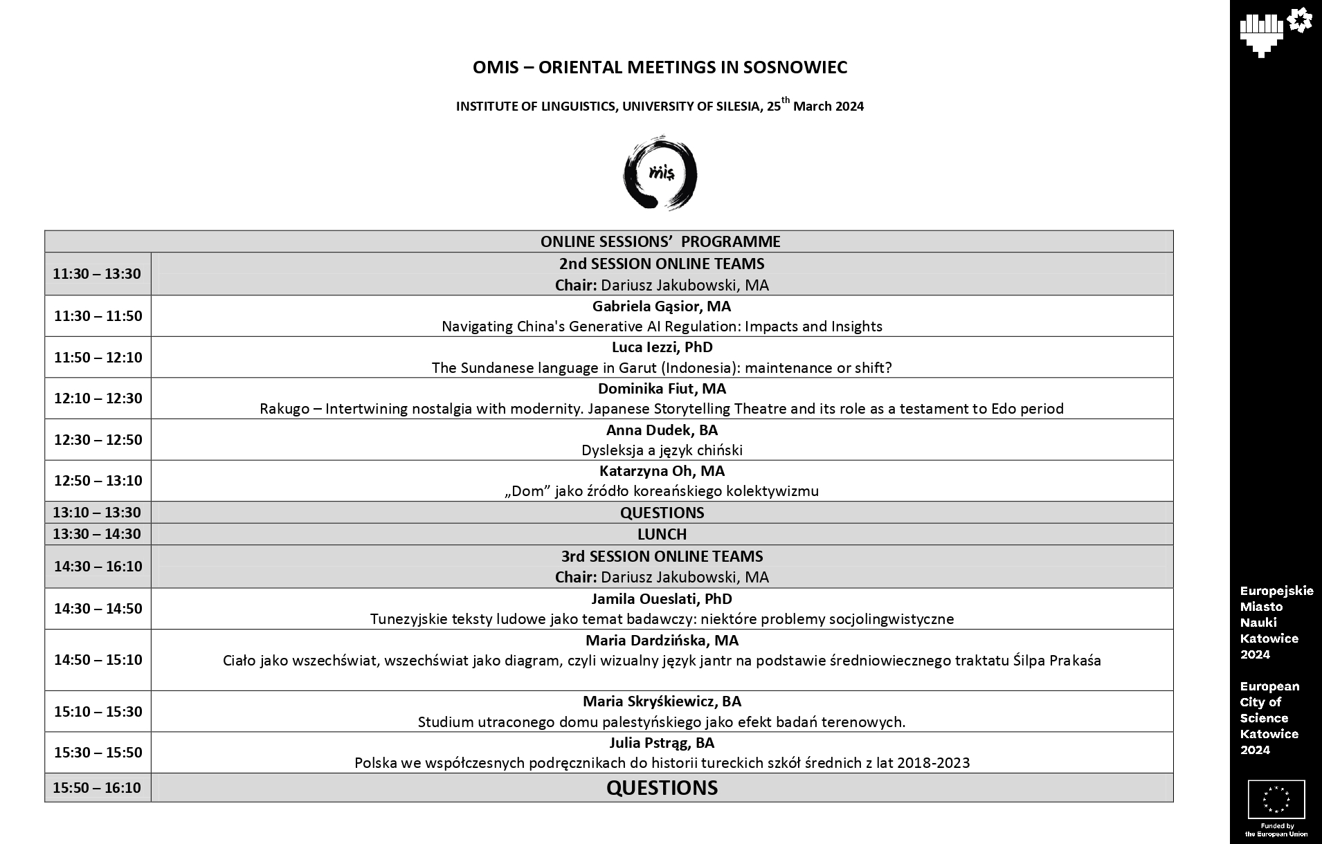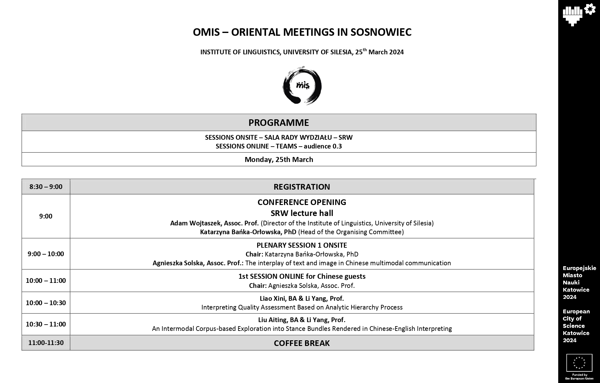 Abstract submission: Abstracts (no longer than 200 words, Times New Roman, 12 pts.) should be submitted in PDF or Word format to konferencja.omis@gmail.com by 18 February 2024 24 February 2024, along with the filled registration form in a PDF format. The body of the email should contain the author’s first name and surname, affiliation and the title of the presentation.